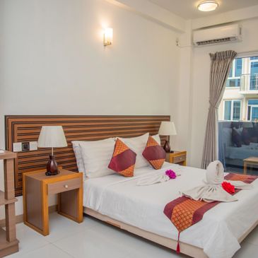 We offer three room types- Twin bed , Queen bed room and King bed room which can accommodate max of 3 adults or 2 adults and 2 children in a room to suit different guest's needs where extra bed is available.